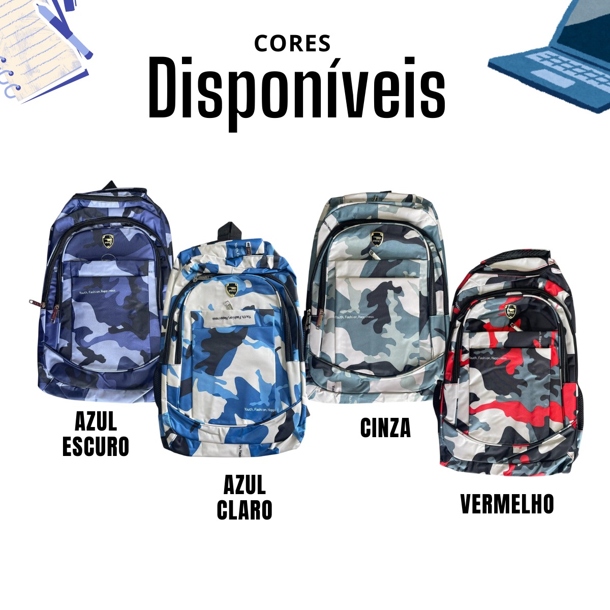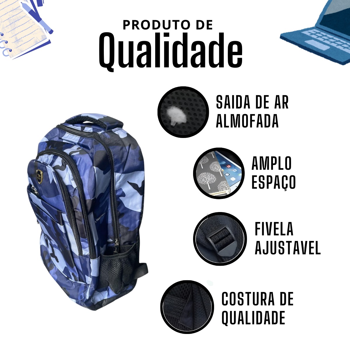 Mochila Bolsa Camuflada Escolar Infantil Juvenil Reforçada – AZUL ESCURO